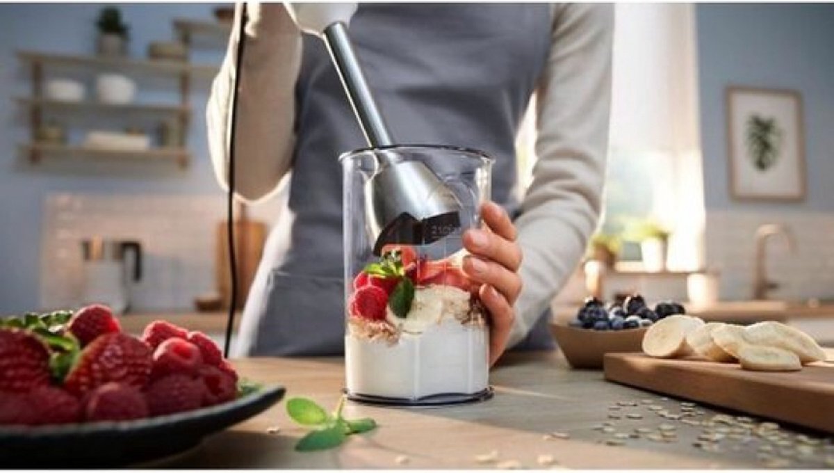 - QuattroBlade-systeem: Vier scherpe messen zorgen voor een krachtig, gelijkmatig en fijn mengen, terwijl de anti-spatfunctie ervoor zorgt dat je keuken schoon blijft tijdens het gebruik.