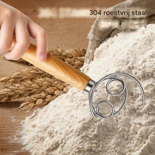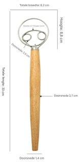 Het royale eikenhouten handvat (ongeveer 33 cm) geeft een betrouwbare, comfortabele grip, ook bij intensief mengen of diep in kommen en pannen. Dankzij de slimme verhouding tussen handgreep en metalen ring mengt u moeiteloos zonder te veel inspanning — ideaal voor grotere porties of taaiere beslagsoorten.